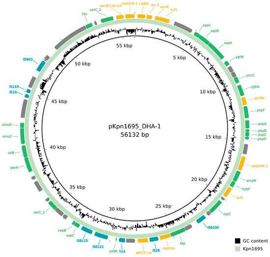 The non-mobilizable IncR plasmid (length = 56,132 bp) named pKpn1695_DHA-1 carried blaDHA-1, blaOXA-1, aac(6′)Ib-cr5, aph(3′)-Ia, qnrB4, mph(A), catB3, arr3, sul1 and emrE (Figure 2). IncR plasmids have been previously linked to the spread of blaDHA-1 in ST11 K. pneumoniae strains [34]. The blaDHA-1 cephalosporinase is currently reported worldwide in K. pneumoniae. The blaDHA-1 β-lactamase is usually co-expressed with plenty of other ARGs, such as extended-spectrum β-lactamases (blaCTX-M-, blaSHV-types), oxacillinases (blaOXA-1), penicillinases (blaTEM-type), carbapenemases (blaOXA-48, blaKPC-2), aminoglycosides (aacA, aadA, armA), fluoroquinolones (qnrB4, aac6′-1b-cr) and sulfonamide (sul1) resistance genes, of which some are also present in the current isolate Kpn1695 (Table 2) [35]. The presence of blaDHA-1 β-lactamase in combination with OmpK35/OmpK36 porin loss has been linked to carbapenem resistance in K. pneumoniae before [36].