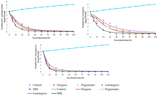 The time-kill kinetics profile of essential oils was determined against selected fungi using MICs of individual essential oil as well as the mixture of all three together in its MIC values (marked as MIX). Figure 1 shows kinetic models for control samples (non-treated fungal suspensions) and time-kill kinetics models for treated suspensions.