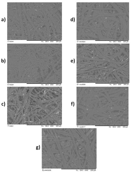 In order to verify decent results provided in previous experiments, the efficacy of an EOs mixture in vapour phase was tested in situ on the historical paper samples. SEM analysis of the samples was carried out in order to detect the difference in microstructure of the historical paper samples artificially contaminated with fungi after the treatment with vapour of EOs mixture, and the same artificially contaminated samples that were not treated with vapour of EOs. In Figure 2a–f, the SEM micrographs for artificially contaminated historical paper substrates non-treated and treated with the vapour of EOs mixture are shown, while in Figure 2g the SEM micrograph of the paper which was used as a blank sample is presented. All of the micrographs were carried out at the magnification ×500.
