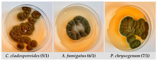 In this study, the following three fungi are used: Cladosporium cladosporoides, Aspergillus fumigatus and Penicillium chrysogenum. Throughout the manuscript they are labelled as 5/1, 6/1 and 7/1, respectively (Figure 3). These strains belong to the private collection of the Laboratory of Microbiology, Faculty of Technology Novi Sad, University of Novi Sad. All three strains have been earlier reported as paper biodeteriogens [48]. The chosen fungi were maintained and cultured onto Potato Dextrose Agar (HiMedia, Mumbai, India). During culturing the inoculated medium was incubated at 25 °C for 7 days. Sterile Petri dishes, without venting, were used in all further experiments.