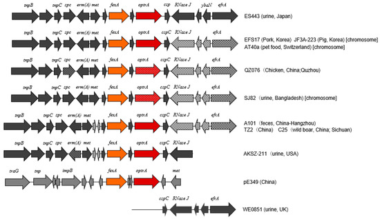 Nucleotide sequence of a region surrounding optrA, i.e., optrA cluster comprising approximately 15 kb, was determined for the LZD-nonsusceptible E. faecalis isolate ES443 and compared with the published sequences (Figure 1). The optrA gene sequence was identical to that of the prototype gene reported for pE349 [24]. The sequences of this region containing fexA-optrA and other genes with identical orientations in E. faecalis strains were explored by BLAST search. The whole region of ES443 showed the highest identity to that of E. faecalis strain EFS17 (from pork in South Korea) (99.86%), JF3A-223 (from pig in South Korea) (99.84%), AT40a (from pet food in Switzerland) (99.83%), QZ076 (from chicken in China) (99.69%), SJ82 (from urine of human in Bangladesh), A101 (from feces of human in China) (99.73%), and so forth. Slight sequence diversity to these strains was found in the downstream region of optrA (e.g., RNase J and efrA). In contrast, RNase J gene of ES443 was identical to that of E. faecalis strain AKSZ-211 (from environment in China) and WE0851 (from urine of human in the UK).