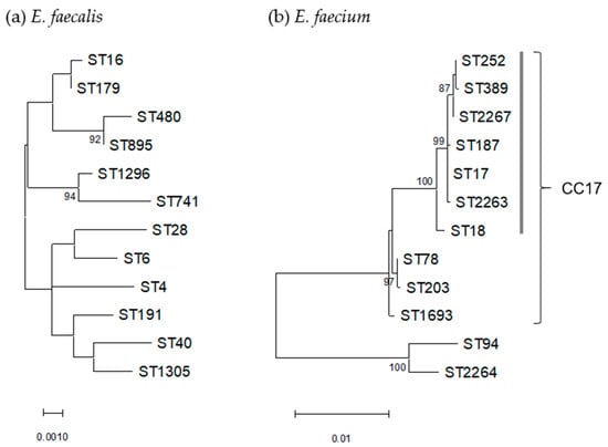 Phylogenetic trees based on concatenated sequences of seven MLST loci of 12 STs each of E. faecalis (a) and E. faecium (b). Dendrogram was constructed by maximum-likelihood method with the MEGA11 program and statistically supported by bootstrapping with 1000 replicates, and genetic distances were calculated by the Kimura two-parameter model. Variation scale is shown at the bottom. Percent bootstrap support is indicated by the values at each node (the values <80 are omitted). A cluster of E. faecium containing ST17 within CC17 is shown by a vertical bar on the right.