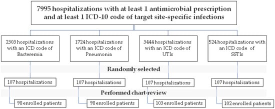 During the 6-month study period, there were 7995 hospitalizations with at least 1 antimicrobial prescription and at least 1 ICD-10 code of target site-specific infections. Of these 7995 hospitalizations, we performed a medical record review and randomly enrolled a total of 401 episodes of the index infection (314 unique patients): 98 patients with bacteremia, 98 with pneumonia, 103 with UTI, and 102 with SSTI. The study flowchart is shown in Figure 2.
