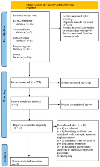 Full texts were screened, and 10 articles were further excluded, specifically because: (n = 4) not relevant; (n = 1) describing antibiotic use combined with antiseptic agents in implant surgery; (n = 1) antibiotics were not used in peri-implantitis treatment; (n = 2) describing prophylactic antibiotic use; (n = 2) reviews were still ongoing (Table 2).