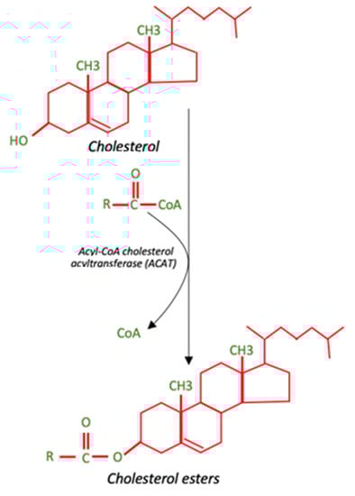 Cholesterol (C27H45OH) is the most abundant member of a family of polycyclic compounds known as sterols, and represents an amphipathic molecule, such as phospholipids, with the polar hydroxyl group located in position 3 and the remaining part of the molecule is completely hydrophobic. In cells, it is usually present as free, unesterified cholesterol, or as esterified cholesterol, in which the hydroxyl group binds to a carboxylic acid and thus generates an apolar molecule [] (Figure 1).