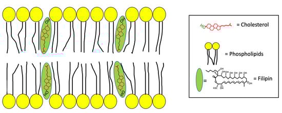 Filipin is an antifungal polyene macrolide antibiotic characterized by a large lactone ring containing five conjugated double bonds [] isolated from the bacterium Streptomyces filipinensis [,,]. It is a naturally fluorescent compound that binds to cholesterol, but not to esterified sterols, and, therefore, is commonly used as a marker for labelling and quantifying free cholesterol in cells and tissues [,,]. In fact, while in the past it has been used as a probe in the study of the membrane structure and sterols distribution [], more recently it is employed to evaluate the cholesterol content in membranes and organelles []. Chemically, filipin is a blend of four components: Filipin I (4%), II (25%), III (53%), and IV (18%), which should more correctly be referred to as the Filipin complex [].The hydrophobic interaction between filipin and cholesterol is achieved thanks to the presence of the 3β-OH group in the chemical structure of cholesterol [], which generates a “filipin-cholesterol” complex located in the hydrophobic layer of biological membranes []. Interestingly, this complex induces a rupture of cell membranes, which progressively leads to the release of cytoplasmic components [], like glucose and enzymes, as observed by electron microscopy in rat erythrocytes []. In fact, since filipin perturbs the structure of lipidic bilayer when it binds to cholesterol, this staining can only be performed in fixed cells and tissues to avoid the appearance of aggregates in the plasma membrane where the filipin-cholesterol complex is located [] (Figure 2).