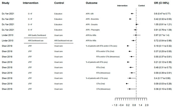 The summary of the results is described in Table S3. There was high heterogeneity due to varying definitions of the outcome, measure types, type of infection and the combination of other interventions. As a result, an overall pooled effect outcome could not be determined. Figure 2 shows the effect of AP changes (primary outcome) in odds ratios, for three studies reporting this outcome. The results illustrate a larger decrease in AP in the intervention group compared to the control group, except Du Yan (2021) [26] for sinusitis and pharyngitis and Linder (2010) who compared the ARI Quality Dashboard versus usual care [23]. However, in Linder (2010), the intervention physicians who used the dashboard at least once were less likely to prescribe antibiotics for all ARIs compared to those who did not use the dashboard [23]. It is notable that only Linder (2010) sent monthly e-mails reminding physicians of the dashboard (Table 1) [23].