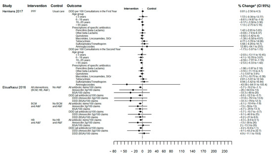 Figure 3 illustrates the effect of AP changes quantified as the percentage change from baseline (between-group difference) for two studies and no overall differences in AP were observed. However, Hemkens (2017) showed that quarterly written personalised prescription feedback was associated with reduced AP in the 6 to 18 year age group in the first year (−9% (CI 95% −15% to −2%)) and in adults (19 to 65 years) in the second year (−5% (CI 95% −8% to −1%)) [28]. Elouafkaoui (2016) reported a 6% reduction in AP in the intervention group (written behaviour change message with peer comparison and A&F relative) to the control group (no A&F). Table S3 describes the result of other intervention subgroups of this factorial study. Elouafkaoui (2016) was the only cluster study that reported an intra-cluster correlation coefficient (0.2 (CI 95% 0.1 to 0.2)). Furthermore, the interval between receiving A&F varied according to allocation (either 0 and 6 months or at 0, 6 and 9 months) [25].