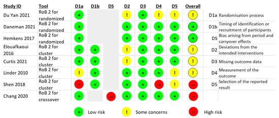 For the cluster RCTs, Shen (2018) had a high RoB due to the sequence generation process, the allocation sequence concealed, measurement of the outcome and selection of the reported result [27]. Two cluster RCTs had deviations from the intended interventions (effect of assignment to intervention) [22,25]. Linder (2010) reported challenges with the randomisation process and selection of the reported result, and the trial protocol was unavailable [23].