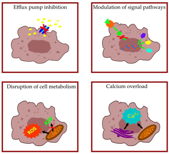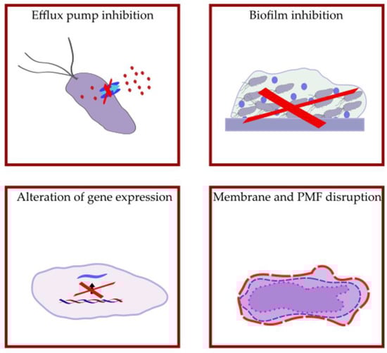 The abolishment of efflux mechanisms could be achieved in different ways: (1) the downregulation of the expression of EP genes, (2) the re-design of antibiotics and development of new antibiotics, (3) the inhibition of the assembly of functional pumps, (4) the inhibition of the substrate binding by competitive or non-competitive inhibitors, (5) blocking the outer membrane channel, as well as (6) interference with the energy supply of pumps [20].