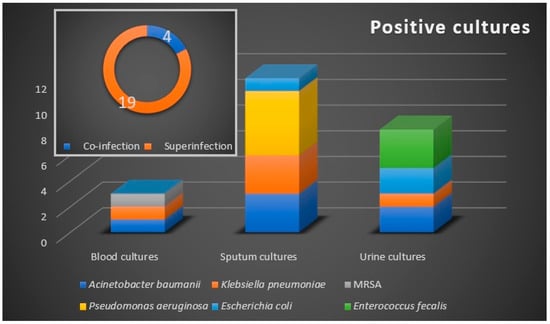 The microbiological samples were positive in 23 (8.2%) patients (Figure 1), with a prevalence of 4 (1.4%) cases of bacterial co-infection, and 19 (6.8%) cases of bacterial secondary infection. The co-infection cases were represented by urinary tract infections, while respiratory tract bacterial secondary infections were confirmed in 12 (4.28%) patients. Urine cultures and hemocultures were positive in eight (2.85%), and three (1.07%) patients, respectively.
