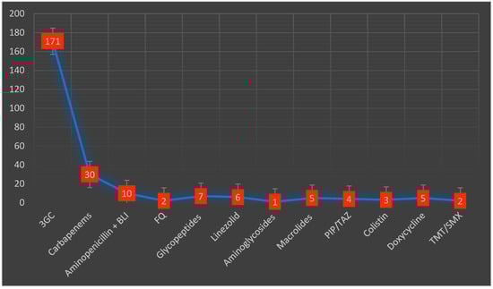 Almost half of the included patients (42%) received antibiotic therapy before admission. Macrolides were the most used antibiotic class in 53 cases (18.9%), followed by second-generation cephalosporins in 34 patients (12%). During their hospital stay, empiric antibiotic treatment was administered in 204 (72.8%) patients. Third-generation cephalosporins were the most frequently prescribed in 171 (73.5%) patients, followed by carbapenems in 30 (13.2%) patients (Figure 2). The average duration of the antibiotic treatment was 8.5 days (3.2). Adjustment of the antibiotic treatment was necessary in 59 cases (25%). Inappropriate empiric treatment required adjustments mostly after the administration of third-generation cephalosporins, usually being replaced by carbapenems. The average number of antibiotics prescribed per patient was 1.4.