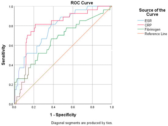 The subsequent areas under the curve (AUC) revealed the adequate performance of ESR (AUC: 0.781) and CRP (AUC: 0.797) in predicting mortality risk, while fibrinogen (AUC: 0.664) exhibited an inferior predictive ability (Table 9).