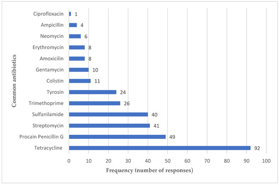 - Frumence, G.; Mboera, L.E.G.; Sindato, C.; Durrance-Bagale, A.; Jung, A.S.; Mshana, S.E.; Clark, T.G.; Legido-Quigley, H.; Matee, M.I. Practices and Challenges of Veterinary Paraprofessionals in Regards to Antimicrobial Use and Resistance in Animals in Dar Es Salaam, Tanzania. Antibiotics 2021, 10, 733. [Google Scholar] [CrossRef] [PubMed]