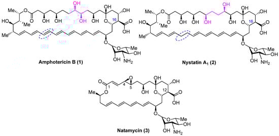 The other significant polyene macrolides in clinical use are nystatin A1 (Figure 1, Nys, 2) and natamycin (Figure 1, Nat, 3) (Figure 1); however, these are not used systemically. Common structural features shared by AmB, nystatin and natamycin include a conjugated double-bond system and the carbohydrate residue mycosamine.