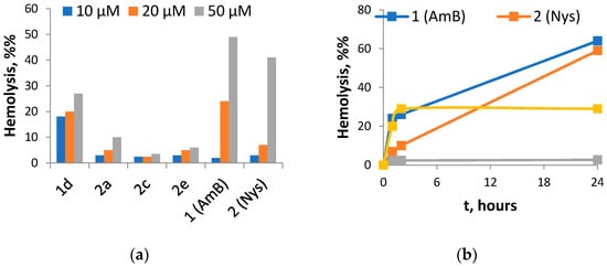 Briefly, erythrocytes were isolated from human blood. The blood was incubated at 4 °C (2–3 h). Erythrocyte suspension (100 µL) was diluted in physiological buffer (pH 7.2) to a total volume of 500 µL. Solutions of the compounds under investigation with an initial concentration of 10 mM (DMSO) were diluted with phosphate-buffered saline (PBS) buffer (1:10). The resulting solutions were added to Eppendorf tubes in the amount necessary to create the test concentration (10, 20 and 50 µM) and a mixture of PBS with erythrocytes was added to a total volume of 200 µL. The mixture of red blood cells with 1% triton X-100 was used as a positive control. Intact control solution was a mixture of erythrocytes with PBS and solvent (DMSO). Probes were incubated for 1 h (additionally for AmB (1), Nys (2), 2c and 1d maximum 24 h) at 37 °C, and centrifuged at 252 relative centrifugal force (RCF) for 1.5 min, and the supernatants were transferred to a 96-well plate. The optical density of supernatants was measured on a microplate spectrophotometer (BioTek, ELx800, Winooski, VT, USA) at 570 nm. The percentages of hemolysis were calculated relative to positive control, which was taken as 100%.