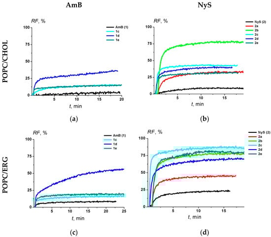 The efficacy of the tested AmB derivatives (1d, 1c and 1e) to disengage calcein from POPC/CHOL vesicles decreased in the following order: 1d (RFmax is about 40%) > 1c ≈ 1e (about 15%) > AmB (1) (about 6%) (Figure 3a and Table 3). In the case of the POPC/ERG liposomes, the RFmax decreased in the same order, but the effects were 1.5-times greater for AmB, 1d, 1c and 1e (Figure 3c and Table 3). In the case of Nys derivatives in the POPC/CHOL vesicles, the RFmax decreased in the following order: 2b (about 70%) > 2c ≈ 2d ≈ 2a (about 40%) > 2e (about 20%) > Nys (2) (about 10%) and in POPC/ERG liposomes it decreased in the series: 2c ≈ 2b ≈ 2d ≈ 2e (about 80%) > 2a (about 45%) > Nys (about 20%) (Figure 3b,d and Table 3).