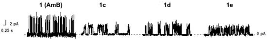 Figure 4 presents the electrical current fluctuations corresponding to the opening and closure of single channels formed by AmB and its tested conjugates, 1c, 1d and 1e, in the lipid bilayers composed of DPhPC and ERG (67/33 mol %) and bathed in 2 M KCl (pH 7.4) at transmembrane voltage 200 mV. One can see that all tested derivatives (1c, 1d and 1e) as well as 1a [35] produced pores of smaller amplitude than those of AmB under the same conditions. The single channel amplitude decreased in the series of AmB > 1d > 1c > 1e.