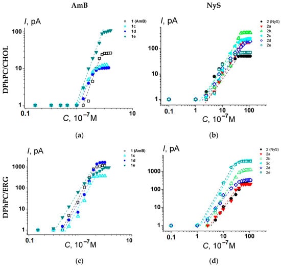The one-sided addition of AmB or Nys to the membrane-bathing solution produced an increase in macroscopic conductance in a dose-dependent manner. Figure 6 shows the bilogarithmic plots of the dependences of steady-state transmembrane current flowing through membranes composed of DPhPC and CHOL or ERG at 100 mV on the concentration of the tested AmB (Figure 6a,b) and Nys derivatives (Figure 6c,d). The slopes of the linear regression of the growth section of the presented curves for AmB and NyS derivatives are close to 5 ÷ 6 and 2 ÷ 3, respectively. This means that the steady-state polyene-induced conductance is proportional to about the fourth to fifth and second to third power of the AmB and Nys derivative concentrations, respectively.