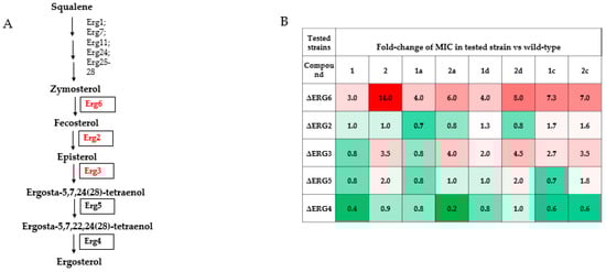 Testing of the MICs of the various mutants showed the following patterns. Compared to wild type yeast, deletion of ERG6 showed the highest increase in relative resistance to 2, as well as to all of the tested derivatives of 1 and 2, with 1 showing the lowest increase in resistance. Amides 1a and 1d retained this property; however, 1c showed increased resistance. All of the tested derivatives of 2 had somewhat lowered relative resistance. Note, this property might be clinically relevant, because ERG6 mutations have been implicated in clinical polyene resistance [52]. Deletion of ERG3 causes resistance to 2 and its derivatives and this resistance does not change depending on the introduced modifications. However, for 1 and its derivatives, the situation is more complex. ERG3 deletion has little effect on the resistance to 1 or 1a, but causes some resistance to 1d and even more so to 1c.