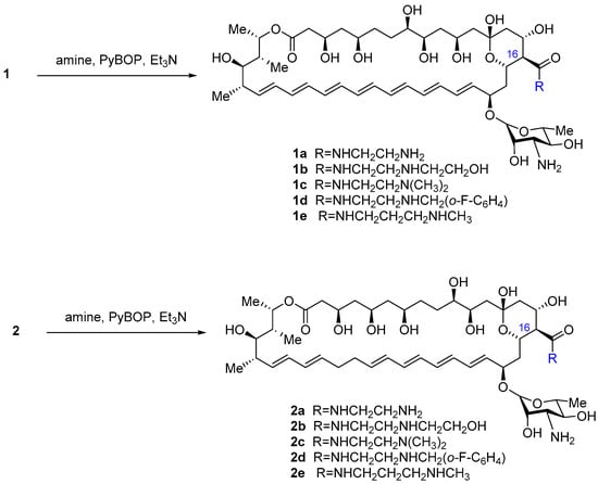 The yields of the target amides 1c–1e, 2a–2e varied from moderate to good (20–60%) due to the well-known lability of polyene antibiotics, their sensitivity to light and oxygen, and basic/acid conditions. AmB derivatives 1a,b were described earlier [35]. All the new amides had considerably higher solubility in water compared to their parent antibiotics. For several of them, the determination of the solubility was performed using UV spectroscopy of standard and saturated solutions according to the method described previously [41,42] with minor modifications. Saturation of the solutions at a concentration of 100 g/L was not achieved for the compounds 1a,c,e, and 2a,c,e, thus indicating a solubility of more than 100 g/L (solubility of AmB–0.75 g/L, Nys–0.36 g/L [43]).