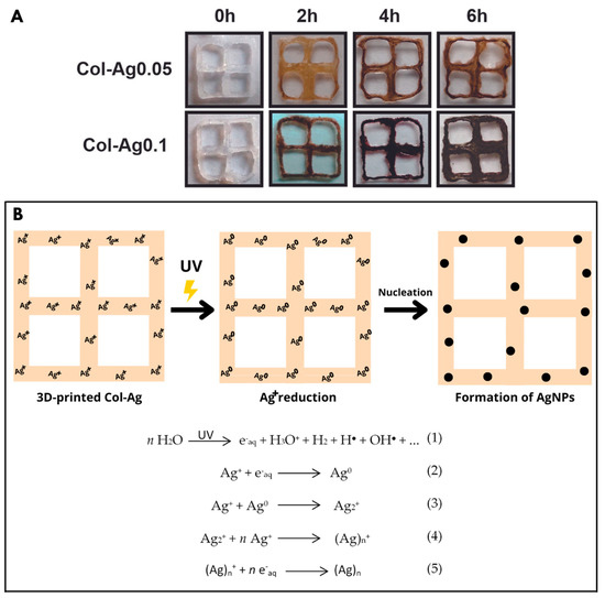 (A) Images of dry 3D-printed collagen-based scaffolds after in situ reduction of Ag by different UV irradiation intervals. Dimensions of 3D-printed collagen-based scaffolds are 6 mm × 6 mm × 2 mm. (B) Schematic illustration of the mechanism of in situ AgNPs formation by using the UV irradiation method.