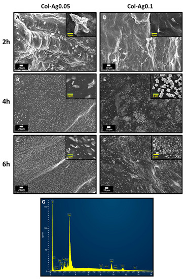 SEM images of (A): Col-Ag0.05-2; (B): Col-Ag0.05-4; (C): Col-Ag0.05-6; (D): Col-Ag0.1-2; (E): Col-Ag0.1-4; (F): Col-Ag0.1-6. (G): Representative EDS analysis of Col-Ag.