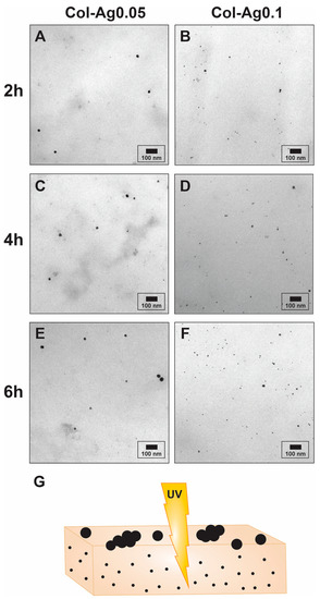 To further characterize the in situ prepared AgNPs, the material was completely degraded by a collagenase solution and the obtained suspension was studied by TEM (Figure 3). Interestingly, the particles formed inside the collagen have a smaller size (Table 1) than those formed on the surface of the material (Figure 2), possibly due to a stabilizing action of the collagen [42] and due to the different degree of UV light penetration among with limited space for particles growth (Figure 3G). This is attractive since the size and morphology are not only controlled through the different conditions of synthesis studied, but they are also given according to the place of the material they are formed, whether on the surface or inside the 3D-printed scaffolds.
