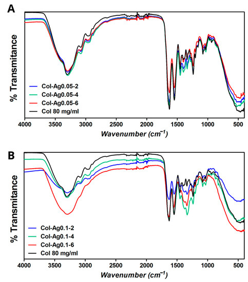 FTIR spectra of 3D-printed Col (in the absence of AgNPs), Col-Ag0.05 and Col-Ag0.1 scaffolds are shown in Figure 4. FTIR analysis was performed to study whether there was an interaction between collagen and in situ synthesized Ag particles. When comparing FTIR spectra of Col, Col-Ag0.05 (Figure 4A) and Col-Ag0.1 (Figure 4B) representative peaks were found. However, a close analysis of the spectra indicates that a more intense band at around 1340 and 1400 cm−1 was observed for 3D-printed Col-Ag0.05 and more clearly in Col-A0.1 scaffolds. These vibration signals, located at 1340 and 1400 cm−1, respectively, could indicate the possible interaction between silver particles and collagen (antiparallel-βsheet) [43]. Furthermore, a decrease in the intensity of the bands at 1635 and 1556 cm−1 corresponding to C=O of amide I and NH groups of amine II of collagen was observed for these scaffolds. This may also indicate that these groups are involved in the reduction and stabilization of silver particles in collagen [36,44].