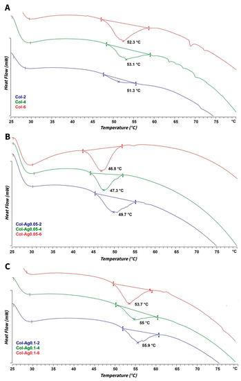 DSC curves of 3D-printed Col scaffolds (Figure 6A) exposed at different UV times show the typical denaturation temperature at ca. 52.0 ± 0.9 °C found in fibrillar collagen [46]. Interestingly, for Col-Ag0.05 and Col-Ag0.1, opposite effects were found. In case of Col-Ag0.05 (Figure 6B), a shifting of DSC curves to lower temperatures is observed. This indicates that the addition of 0.05 M concentration of Ag produces a destabilization of collagen fibrils by interfering in the self-assembling processes of collagen molecules. This effect can be attributed to the binding of silver ions with collagen, mainly sulfhydryl groups of the fibrillar protein, which finally leads to a decrease in the denaturation temperature of the collagen [47,48]. However, when Col-Ag0.1 (Figure 6C) was analyzed, DSC curves were obtained at higher temperatures than Col. This suggests that under this conditions collagen is stabilized by a higher concentration of Ag (0.1 M) through other chemical interactions [49]. In fact, FTIR spectra indicate that the interactions between Ag and amides groups of collagen are stronger in Col-Ag0.1 than in Col-Ag0.05. This effect is in good agreement with previous data showing that silicic acid influenced the self-assembly of collagen triple helices and, consequently, their denaturation temperature. On the one hand, at low silicification rates, a slightly diminution in the denaturation temperature was attributed to the charges provided by the inorganic component which hinders the correct aggregation of collagen. On the other hand, a significant increase in collagen thermal stability was reported in the presence of higher silicate content due to the coverage of collagen fibril with the inorganic component that stabilized its structure [6,50].