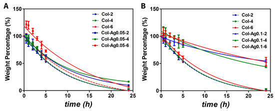 Collagenase degradation test of 3D-printed collagen-based scaffolds. Weight percentage is shown as a function of time comparing Col with Col-Ag0.05 (A), and Col with Col-0.1 (B). Col-2(--●--blue), Col-4(--●--green), Col-6 (--●--red), Col-Ag0.05-2 (-■-blue), Col-Ag0.05-4 (-■-green), Col-Ag0.05-6 (-■-red), Col-Ag0.05-2 (-▲-blue), Col-Ag0.05-4 (-▲-green), and Col-Ag0.05-6 (-▲-red). Results are expressed as mean ± SD from triplicate experiments.