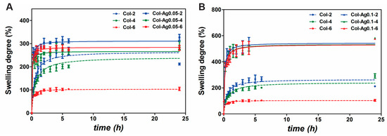 Swelling capacity of Col-Ag0.05 (A) and Col-Ag0.1 (B). Col-2(--●--blue), Col-4(--●--green), Col-6 (--●--red), Col-Ag0.05-2 (-■-blue), Col-Ag0.05-4 (-■-green), Col-Ag0.05-6 (-■-red), Col-Ag0.05-2 (-▲-blue), Col-Ag0.05-4 (-▲-green), and Col-Ag0.05-6 (-▲-red). Results are expressed as mean ± SD from triplicate experiments.