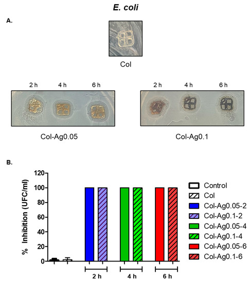 Antimicrobial activity of 3D-printed Col and Col-Ag gels against E. coli. (A) Disk diffusion method. (B) Percentage of growth inhibition, evaluated by the dilution method.