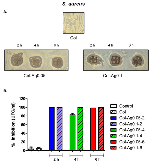 Antimicrobial activity of silver in 3D-printed Col and Col-Ag gels against S. aureus. (A) Disk diffusion method. (B) Percentage of growth inhibition, evaluated by the dilution method.