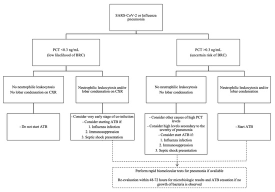 Recognizing bacterial co-infection among patients with SARS-CoV-2 and Influenza pneumonia requires a high index of suspicion. Despite this challenging diagnosis, it is not justified to start antibiotics indiscriminately to all patients with viral pneumonia. Some features of the presence of associated bacterial respiratory co-infection may still be identifiable despite a significant overlap of viral and bacterial infection. Neutrophilic leukocytosis is the hallmark of bacterial pneumonia, along with lobar or segmental air-space opacification with air bronchograms [63]. However, in severe viral respiratory infections these characteristics may be present in patients who develop critical illness with acute respiratory failure. Hence, we are convinced that initial values of PCT may help clinicians with the decision to initiate or withdrawn antibiotic treatment so as to avoid overprescribing antibiotics when unnecessary. Based on the aforementioned scientific evidence and previously recognized associated factors with bacterial co-infection in viral pneumonia as immunosuppression or septic shock presentation [60,64,65] we propose a practical PCT algorithm for clinical decision making to guide antibiotic initiation in cases of Influenza and SARS-CoV-2 pneumonia (Figure 1). Likewise, in case of not prescription of antibiotics in suspected viral CAP based on a medical decision supported by low PCT levels, it would be recommended a close monitoring and follow up, reconsidering to administer antibiotic treatment if rapid clinical deterioration or promptly increase of PCT levels within 24–48 h.
