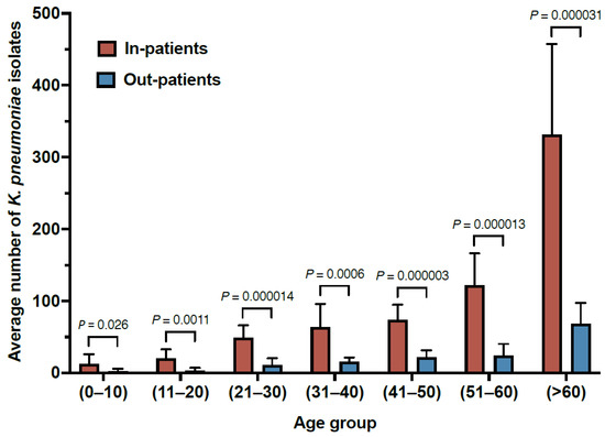 Throughout the study period, the results showed a significantly higher rate of K. pneumoniae isolated from inpatients (mean: 672.5 ± 193.6) compared to outpatients (mean: 147 ± 51.9) (Table 1 and Figure 1). In addition, higher rates of K. pneumoniae isolates were obtained from male subjects compared to females (p value ≤ 0.0001) (Table 1). The results also showed a direct correlation between age and the rates of K. pneumoniae isolates (Figure 1). Collectively, these results may suggest that prolonged hospitalization and weakened immunity due to aging are potential risk factors for K. pneumoniae infection.
