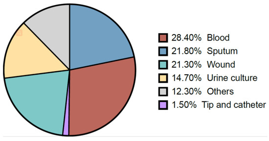 The proportion of different specimen types from which K. pneumoniae was obtained.