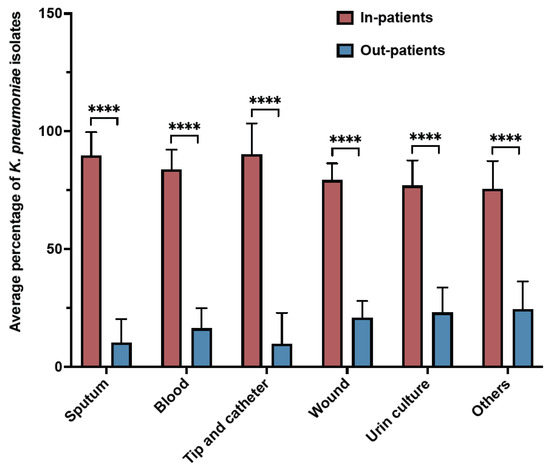 During the study period, K. pneumoniae isolates were reported mostly from blood samples (28.4%), followed by sputum (21.8%), wounds (21.3%), urine (14.7), and tip and catheter (1.5%) (Figure 2). Overall, the results showed a gradual increase in the percentage of detection of K. pneumoniae isolates from different samples over the years (Table 2). Regardless of the sample origin, K. pneumoniae isolates were significantly higher from inpatient specimens (mean: 82.55 ± 6.3) compared to outpatients (mean: 17.45 ± 6.4) (Figure 3). For example, 83.65% of K. pneumoniae isolated from blood samples were obtained from inpatient specimens, and the remaining 16.35% were from outpatients (Figure 3).