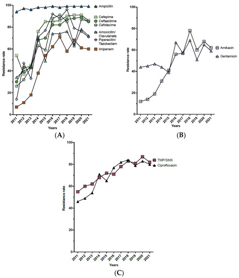 Carbapenem is a potent antibiotic to treat infections caused by Gram-negative bacteria. It has been used for a long time as a first choice to treat infections caused by ESBL-producing bacteria. However, resistance to carbapenems is alarmingly increasing, resulting in a future global crisis [28,29]. In this study, we assessed the resistance profile to imipenem, which showed a remarkable increase in the resistance rate over the study period from only 6.6% in 2011 to 59.9% in 2021. The rapid increase in carbapenem-resistant Enterobacteriaceae (CRE) has been reported both locally and globally [12,13,14,30,31]. This increase in CRE is linked to the increased use and consumption of β-lactamase inhibitors [32,33].