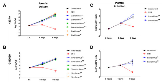 Mtb H37Rv reference strain and GM2659 clinical isolate (≈1 × 105 CFUs/mL) were incubated with the minimal and maximal therapeutic concentration of Everolimus (3 and 8 ng/mL, respectively), sirolimus (5 and 15 ng/mL, respectively) and temsirolimus (585 and 2400 ng/mL, respectively) (Sigma) [35,36]. Untreated cultures and samples incubated with INH (0.2 ng/mL) were used as controls. Each experiment was carried out in 7H9 medium enriched with 10% ADC and 0.05% Tween80, as described above. Bacteria were seeded in sterile 5 mL tubes and incubated at 37 °C for 15 days. An aliquot of each suspension was serially diluted and plated on 7H11 containing 10% OADC which was incubated in standard atmospheric conditions.