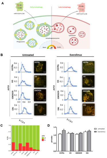 Schematic representation of the mRFP-EGFP-LC3B reporter system used to assess the impact of Everolimus on the autophagic process [19]. (A) THP1 cells constitutively express a recombinant LC3B linking mRFP and EGFP. When autophagosomes fuse with a lysosome the mRFP-EGFP-LC3B is lipidated, and it detaches from the autolysosome membrane. The signals from EGFP that were present within the inner autophagosome membrane are quenched in the autolysosomal environment. The number and pH of autophagic intermediates are reported as AIPD and as pH distribution of the number of autophagic intermediates per cell. AIPD shape and amplitude are sensitive to alterations in the autophagy pathway and allow a quantitative estimation of autophagic flux by retrieving the concentrations of autophagic intermediates. An increase in FG/FR ratio indicates an increase in autophagomes. A shift of AIPD toward low FG/FR values indicates that the pH of autophagic intermediates is shifting to acidic values and autolysosome formation. THP-1 RFP-LC3-GFP cells were infected with Mtb H37Rv, GM2659, MtbH3, and MtbEAI at MOI 1:1 (B). Cells were treated with EverolimusM 8ng/mL one hour post infection. Quantitative assessment of autophagic flux and pH variation were assessed five hours post infection. Reported in the graphs are the AIPD and pH distribution expressed as ratios FG/FR between the AIPD area of a fixed threshold value. Ratio between auophagosomes (AP) and auophagolysosomes (AL) is reported as a bar plot (C). pH variations (pH index) are represented as histograms (D). Data were analysed using two-way ANOVA with Bonferroni’s multiple-comparisons test.