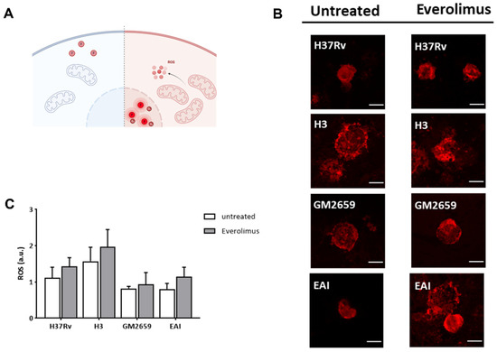 Previous studies linked the observed anti-mycobacterial effect of Everolimus to its ability to induce the formation of reactive oxygen species (ROS) [12]. Hence, we measured ROS in THP-1 macrophages previously infected with Mtb H37Rv, GM2659, MtbH3, and MtbEAI strains following Everolimus administration at maximum therapeutic concentration. After infection, cells were marked with CellROX reagent (ThermoFisher) which measures oxidative stress in live cells. This compound is a DNA dye weakly fluorescent in the reduced state, which exhibits bright fluorescence upon oxidation (Figure 4A). However, in our experimental settings, we did not observe any significant increase in ROS production (Figure 4B–C). Taken together, these findings suggest that Mtb persists in early autophagosomes with no or only a minor shift versus autolysosomes, regardless of Everolimus treatment.