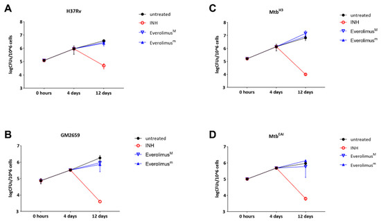 Evaluation of the long-term effect of Everolimus maximal and minimum therapeutic concentrations (EverolimusM and Everolimusm) in the ex vivo Mtb infection model. Modern (Mtb H37Rv and MtbH3) and ancient (GM2659 and MtbEAI) strains were used to infect peripheral blood mononuclear cells (PBMCs) at MOI = 1:10. Everolimusm (3 ng/mL), EverolimusM (8 ng/mL), and INH (0.2 µg/mL) were added four days post infection. Colony-forming unit (CFU) analysis was performed 4 days post infection and 12 days post infection, and reported for Mtb H37Rv (A), GM2659 (B), MtbH3 (C), and MtbEAI (D). Average ± SD of CFUs were represented in log10 scale.