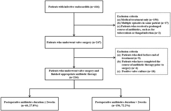 Among 416 patients with IE, 216 patients who underwent heart valve surgery and finished antibiotic therapy were enrolled (Figure 1). The duration of postoperative antibiotic therapy was more than two weeks in 72.2% of the patients (156/216) and two weeks or less in 27.8% (60/216) of the patients.