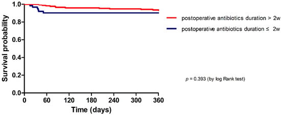 The median follow-up duration was 73 (IQR, 46–109) months. The IE relapse rate was 0.9% (2/216) (Table 2). There was no statistical difference in relapse (0.0% vs. 1.3%, p = 0.379), 1-year recurrence (1.7% vs. 1.3%, p = 0.829), 1-year reoperation (1.7% vs. 1.9%, p = 0.901), or 1-year mortality (10.0% vs. 5.8%, p = 0.274) according to postoperative antibiotics duration. The trend in 1-year mortality between groups was determined by the Kaplan–Meier curve and log-rank test (p = 0.393) (Figure 2).