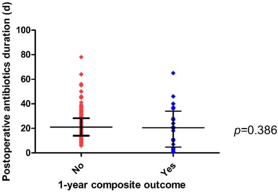 The median duration of postoperative antibiotic treatment was 21 (IQR: 14–28) days in IE patients who underwent valve surgery and lacked the 1-year composite outcome, but 20.5 (IQR: 5–34) days in IE patients with the 1-year composite outcome (p = 0.386). There was no statistically significant difference between the two groups (Figure 3). The variability of postoperative antibiotic duration is presented in Figure S1.