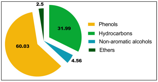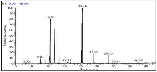 A gas chromatograph of the Thermo Electron type (Trace GC Ultra) and a mass spectrometer system of the Thermo Electron Trace MS type were used for the chromatographic examination of EOs (Thermo Electron: Trace Ultra GC, Polaris Q MS). The fragmentation was achieved with an electronic impact intensity of 70 eV. A DB-5 column (5% phenyl-methyl-siloxane) (30 m × 0.25 mm × 0.25 m film thickness) and a flame ionization detector (FID) powered by a mixture of He gas/air were installed in the chromatograph. For 5 min, the column temperature was designed to rise at a rate of 4 °C/min from 50 to 200 °C. The used carrier gas was nitrogen, flowing at a rate of 1 mL/min in the split injection mode (leak rate: 1/70). By comparing the essential oil compounds’ Kováts index (KI) and Adams to those of the reference products noted in the literature, the essential oil compounds were identified [57,58]. Additionally, the mass spectra and indexes of each of these compounds were compared to those in the aforementioned databases [59]. The retention duration of any product is compared using the Kováts index to a linear alkane with the same carbon number.