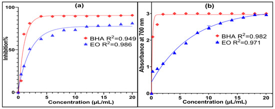 According to the method described by [61], the total antioxidant capacity (TAC) of the essential oil was evaluated. One milliliter of the reagent solution was added to an aliquot of 100 L of each essential oil that had been diluted in ethanol (0.6 M sulfuric acid, 28 mM sodium phosphate, and 4 mM ammonium molybdate). For 90 min, the tubes were incubated at 95 °C in a bath of boiling water. The absorbance of the aqueous solution of each sample was measured in the spectrophotometer at 695 nm after the samples were cooled to room temperature (Genesys 10 UV, Thermo Scientific, Bordeaux, France). BHA was employed as the BHA standard, and the results were represented as equivalents of ascorbic acid (mg/g) of the oil.