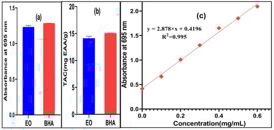 (a)Absorbance at 695 nm, (b) total antioxidant capacity of the EO of O. elongatum and BHAstandard; (c) Regression curve of ascorbic acid.