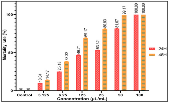 Mortality rate of adults of C. capitata at different concentrations of EO of O. elongatum after 24 and 48 h of exposure (The results are significantly different (p < 0.0001).